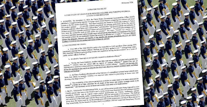 BLUF from the memo: A year of draconian punishments being imposed on nine USAFA seniors who were on the USAFA men’s varsity soccer team illustrates how the substance and the procedures USAFA uses to impose major conduct punishments are illusory, inadequate, unclear, inconsistent, unreasonable, unfair, counterproductive, deficient and denials of due process.