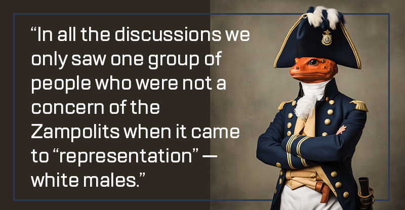 In all the discussions we only saw one group of people who were not a concern of the Zampolits when it came to “representation” — white males.