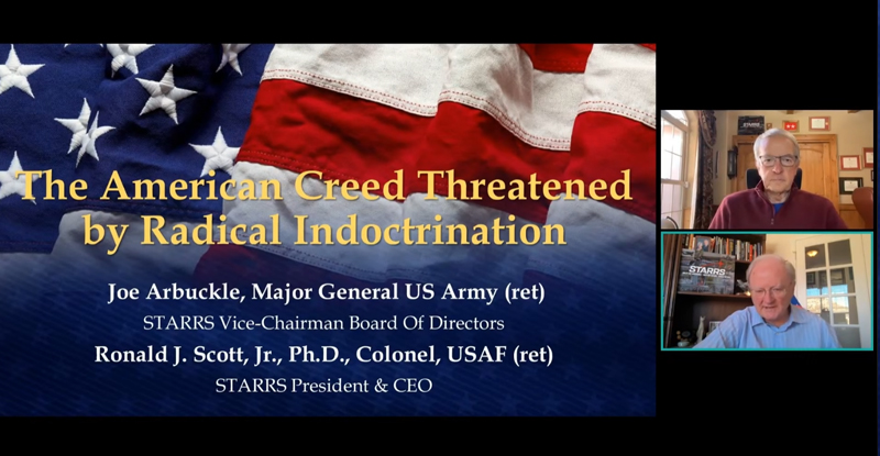 STARRS leaders Major General Joe Arbuckle, US Army retired, and Colonel Ron Scott, PhD, US Air Force retired, give an important online presentation of “The American Creed Threatened by Radical Indoctrination”. STARRS can give this presentation to your group or organization in-person or online, please contact us to request a briefing.