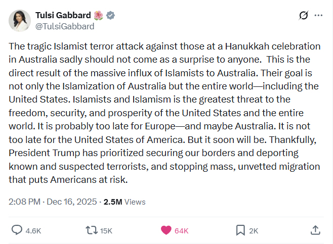 On December 20, 2025, Director of National Intelligence and Army officer Tulsi Gabbard addressed Turning Point USA’s AmericaFest in Phoenix, Arizona. Watch or read the transcript of her remarks is below.