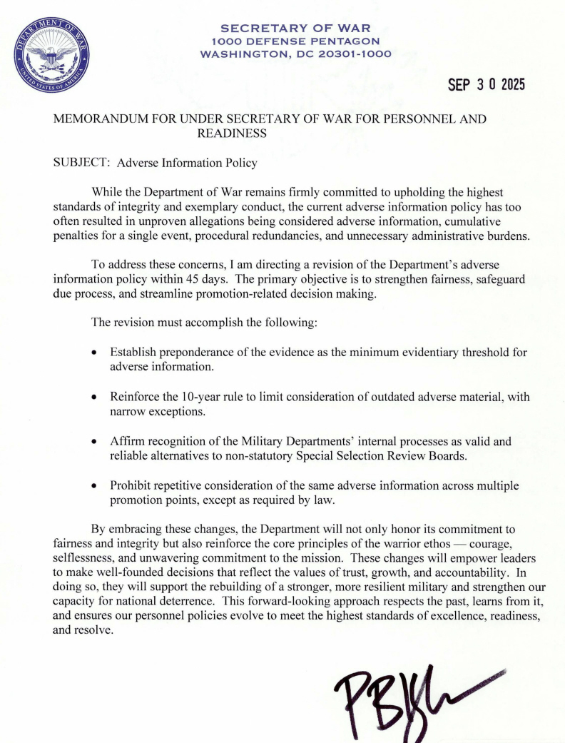 To address these concerns, I am directing a revision of the Department’s adverse information policy within 45 days. The primary objective is to strengthen fairness, safeguard due process, and streamline promotion-related decision making.