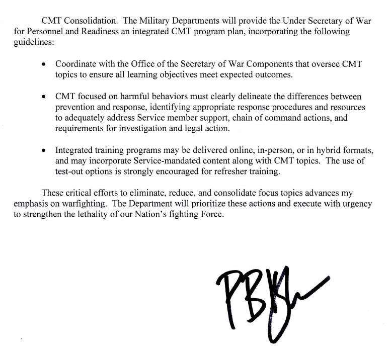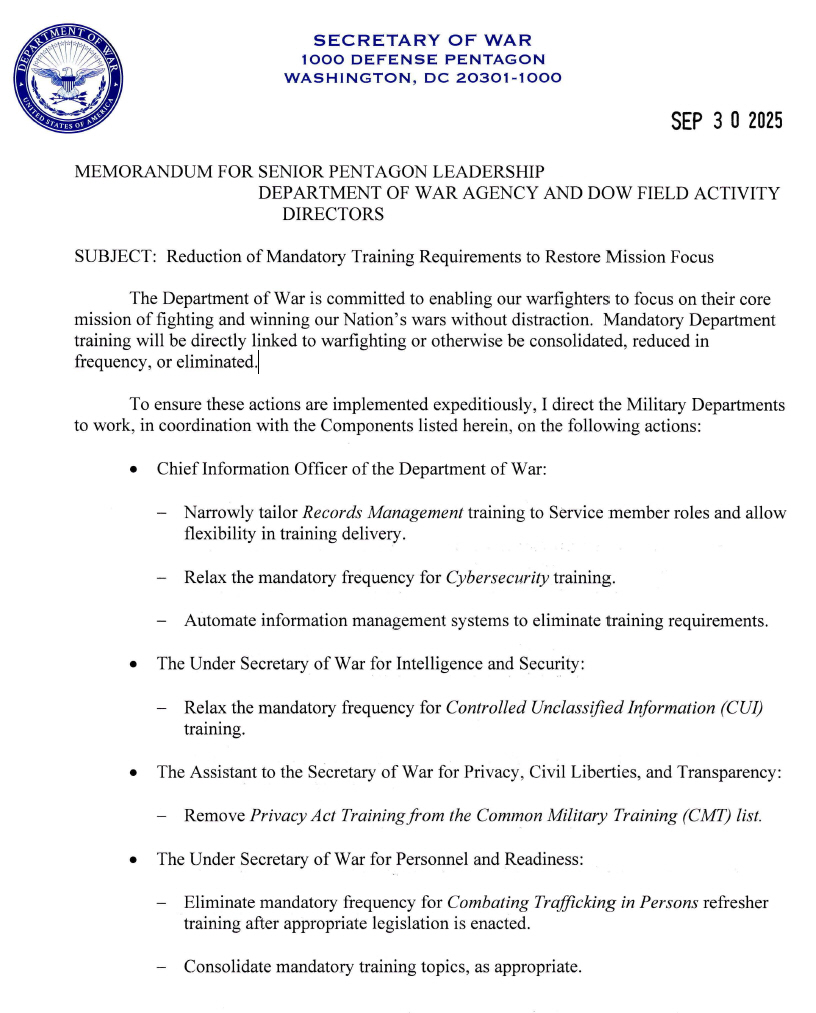 The Department of War is committed to enabling our warfighters to focus on their core mission of fighting and winning our Nation’s wars without distraction. Mandatory Department training will be directly linked to warfighting or otherwise be consolidated, reduced in frequency, or eliminated.