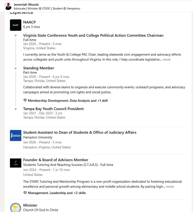 Woods has volunteered for the NAACP for over 6 years and in January 2026 he was appointed as the political action chair for the NAACP Virginia State Conference Youth & College Division. He was once an intern for a Florida Democrat and worked for Virginia Democrat Joshua Cole in the Spring of 2025.
