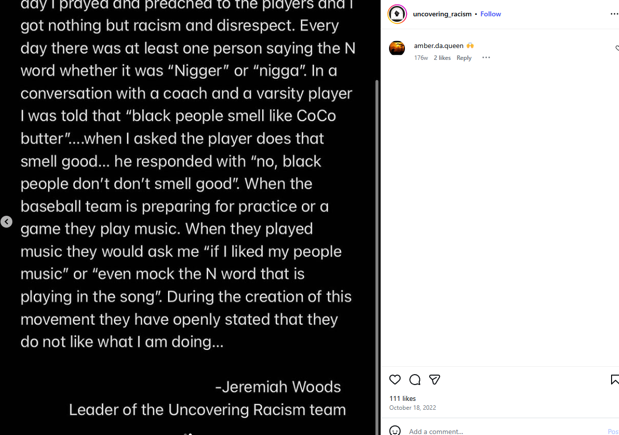 Woods has been manufacturing racism narratives for years, beginning in high school. He is the leader of a so-called “anti-racist” group started in 2022. His social media page is called “uncovering racism” and solicits people to send anonymous, unsubstantiated tips about racist statements.