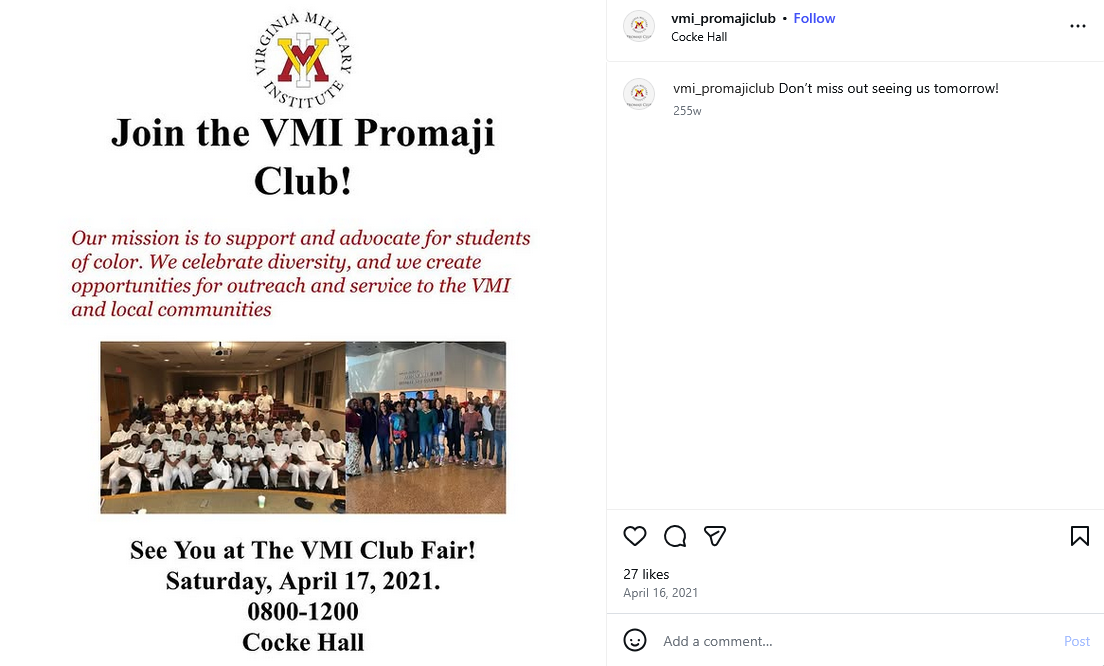 VMI has a race-based student club called Promaji that Woods was actively involved with. The website describes the club as a “black student organization” formed to “create a community for minorities on post.” Their mission is to “support and advocate for students of color.” The exclusion of white students in this mission statement is in direct conflict with the Civil Rights Act which prohibits discrimination based on race.