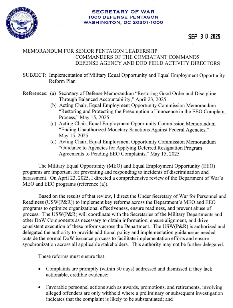 In a memorandum the secretary signed today, titled “Implementation of Military Equal Opportunity and Equal Employment Opportunity Reform Plan,” he listed three things these reforms must ensure: