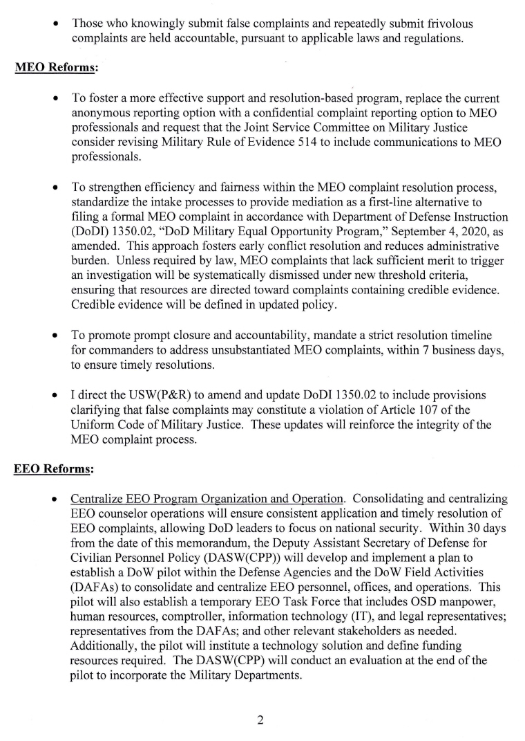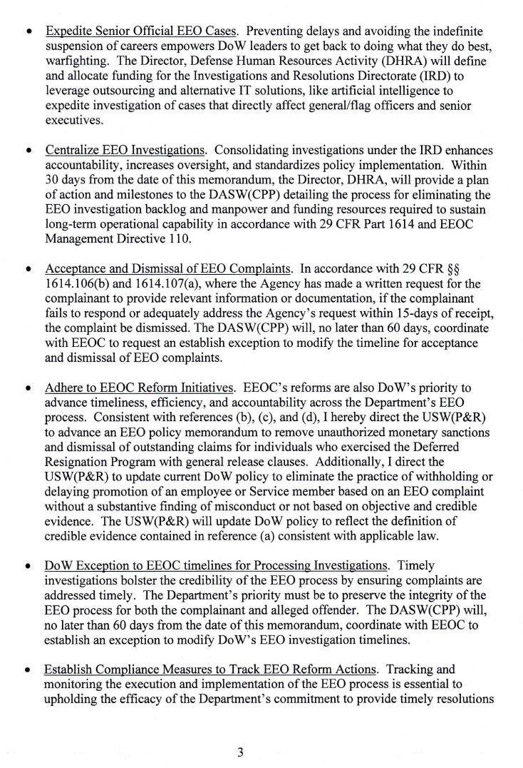The department will be overhauling the inspectors general, equal employment opportunity and military equal opportunity processes.