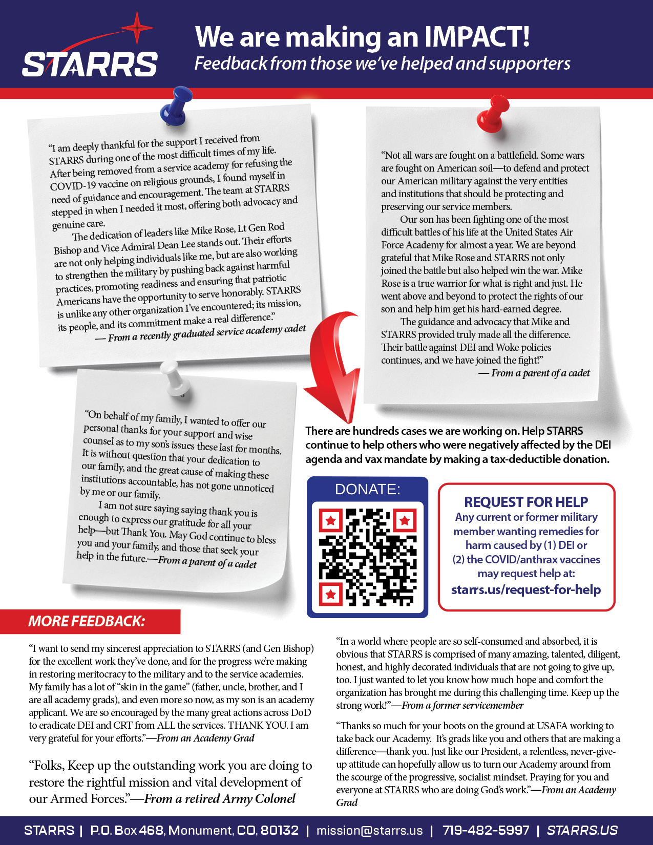 STARRS is also utilizing its legal counsel and a cadre of attorneys to remedy dismissals and punishments of our military members and service academy cadets resulting from the DEI agenda and the illegally implemented COVID-19 vaccination mandate. We currently have over 180 cases of people who really need help getting their careers and lives back and who want to serve again, and we’ve had many success stories. Contact us if you know a servicemember who needs help in these areas.