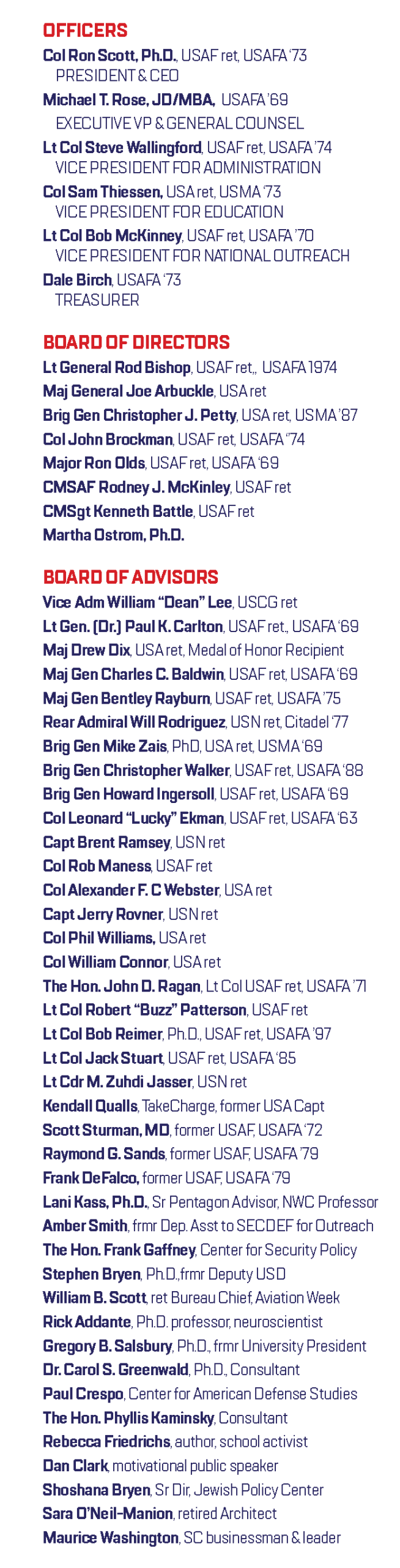 We are heavily engaged with members of the Trump Administration on policies to return to our country’s original founding values. We are having a significant influence on Congressional members working to remove radical leftist CRT (Critical Race Theory) and its spin-off program DEI (diversity, equity, and inclusion), from our military forces, including the service academies.