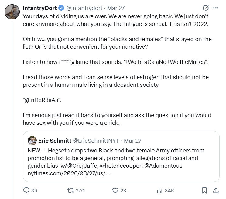 - New York Times: Hegseth Strikes Two Black and Two Female Officers From Promotion List