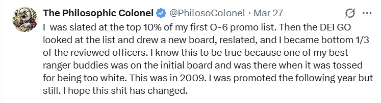 “Under Secretary Hegseth, military promotions are given to those who have earned them,” he went on. “Meritocracy, which reigns in this department, is apolitical and unbiased.”