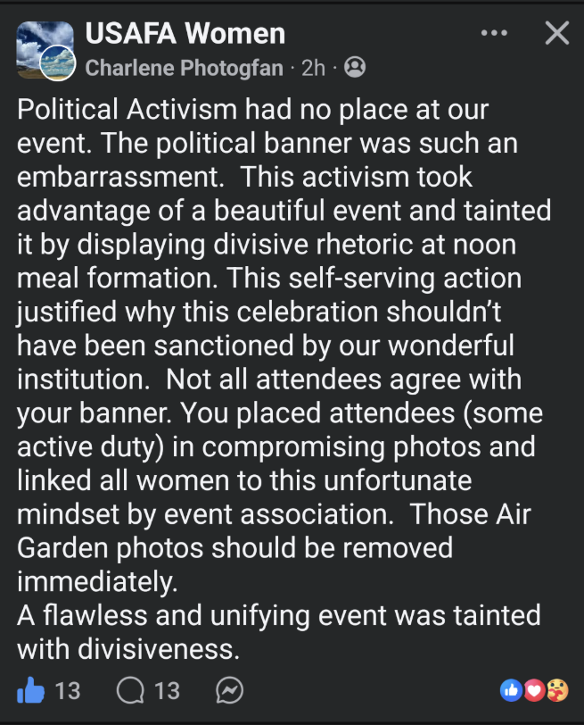 See posting on the “USAFA Women” private Facebook Group with 1.6K members.