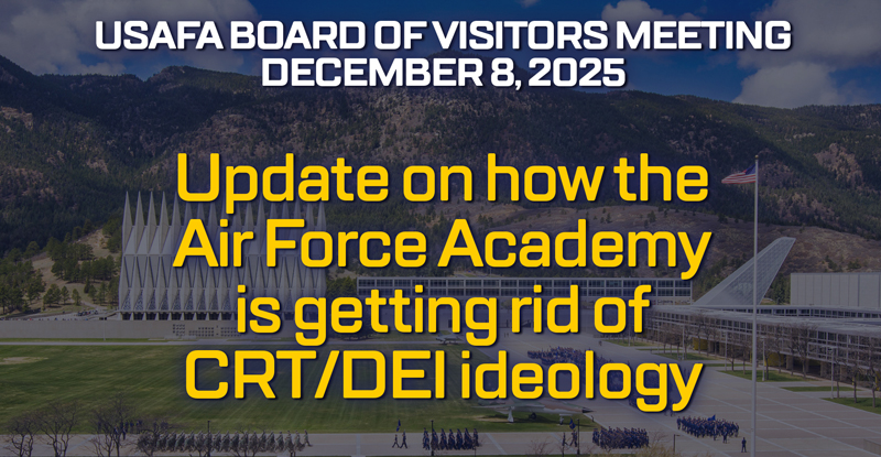 At the December 8, 2025 meeting of the Board of Visitors for the US Air Force Academy, a report was presented on how USAFA is meeting the requirements of White House and Pentagon orders to remove the divisive CRT/DEI ideology from the military, including USAFA.