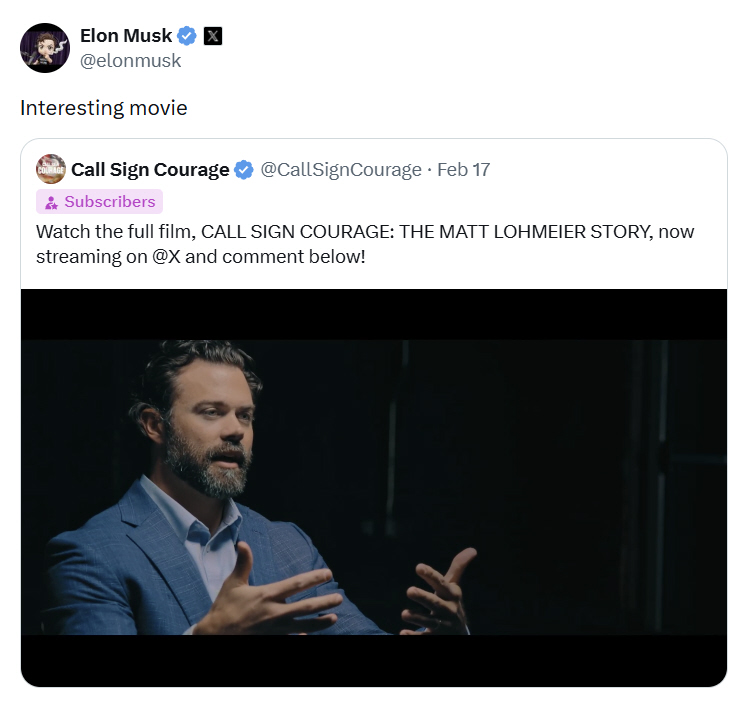 The documentary that former STARRS Executive Vice President Matt Lohmeier worked on for two years before he was named by President Trump and confirmed to be the Under Secretary of the Air Force can be viewed on X by becoming a subscriber to the @CallSignCourage X account for $1 per month.