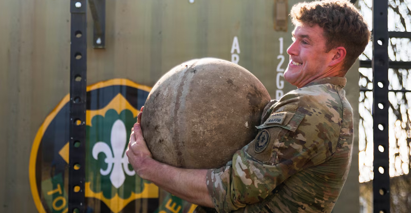IMAGE: Army Strong–Army 1st Lt. Mark Nylund lifts an Atlas stone in Vilseck, Germany, March 20, 2026. The training focused on warfighting readiness by preparing soldiers for the grueling, combat-focused challenges of the Best Ranger Competition.